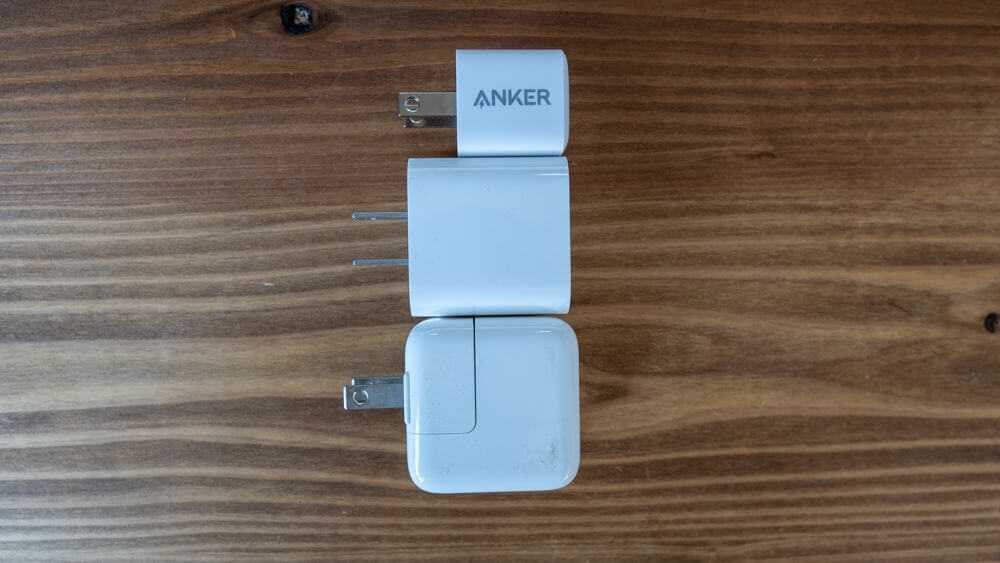上から最大20W、18W、12Wの充電器。Anker PowerPort III Nano 20Wが群を抜いて最小となっています。